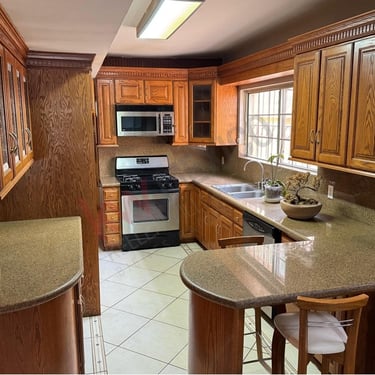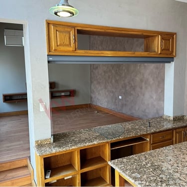 • Cocina integral de encino con barra-desayunador con placa de granito